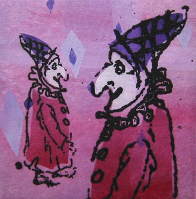 indecent jester 2000 edition of 6 etching/stencil/chine colle paper 12x12 inches | image 3.5x3.5 in